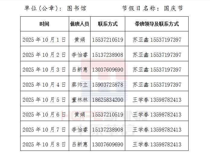 根据国家节假日放假规定,结合图书馆实际,经研究决定,现将2025年国庆节放假安排通知如下:
