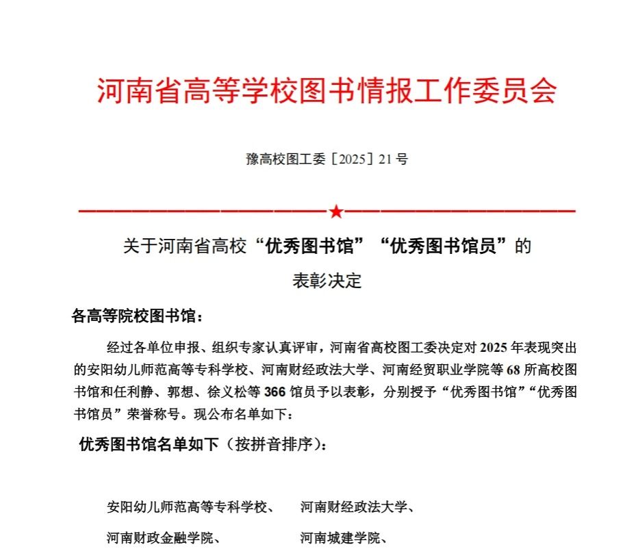 近日,河南省高校图书情报工作委员会发布了《关于河南省高校“优秀图书馆”“优秀图书馆员”的表彰决定》,林州建筑职业技术学院图书馆凭借其出色的工作表现和卓越的服务质量,从众多高校图书馆中脱颖而出,荣获了2025年度河南省高校“优秀图书馆”的荣誉称号。