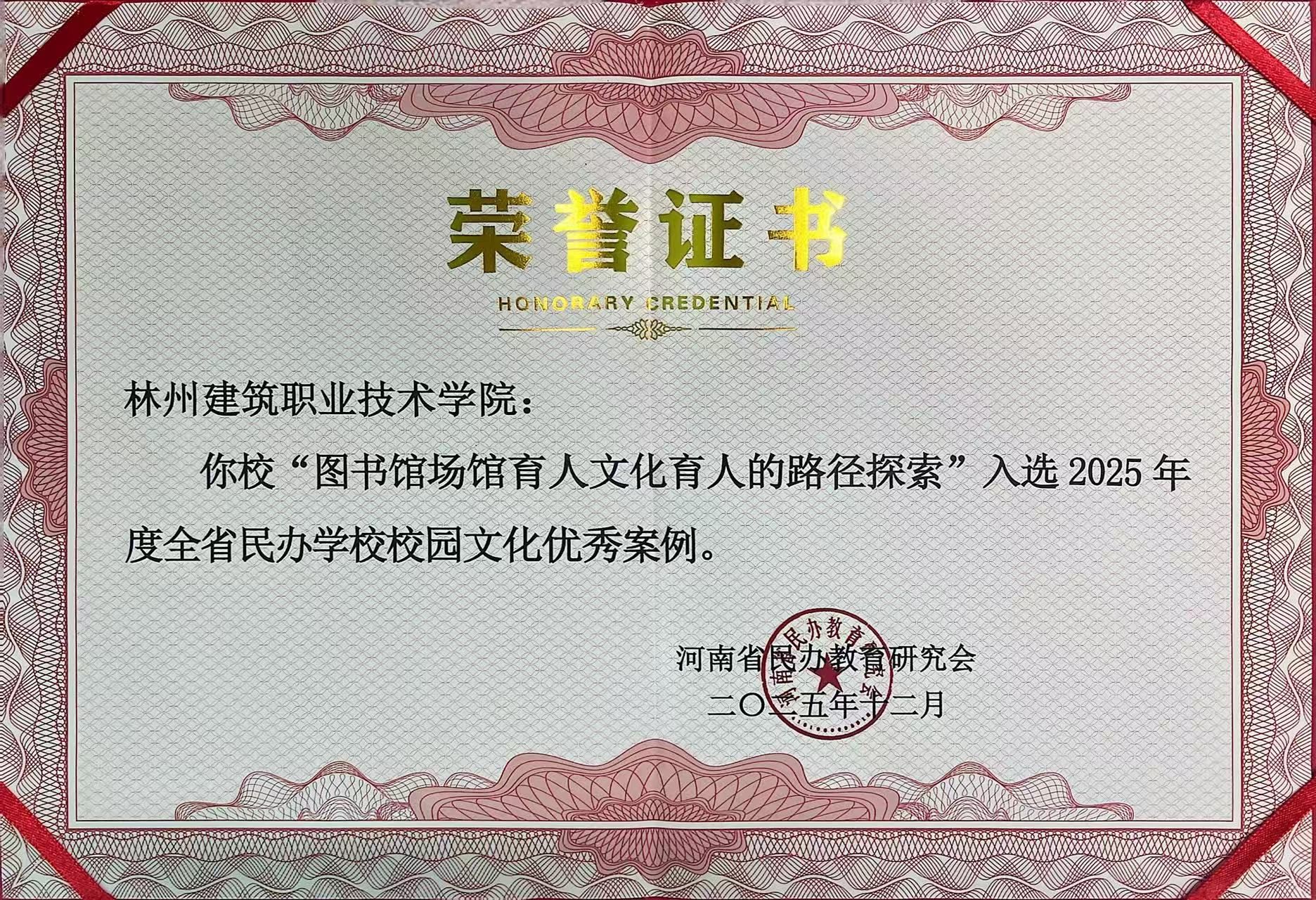 近日,河南省民办教育研究会正式公布了2025年度全省民办学校优秀办学实践案例评选结果,林州建筑职业技术学院图书馆申报的“图书馆场馆育人文化育人的路径探索”项目,凭借其独特的育人理念、丰富的实践内容和显著的育人成效,成功入选全省民办学校校园文化优秀案例,为我校赢得了荣誉。
