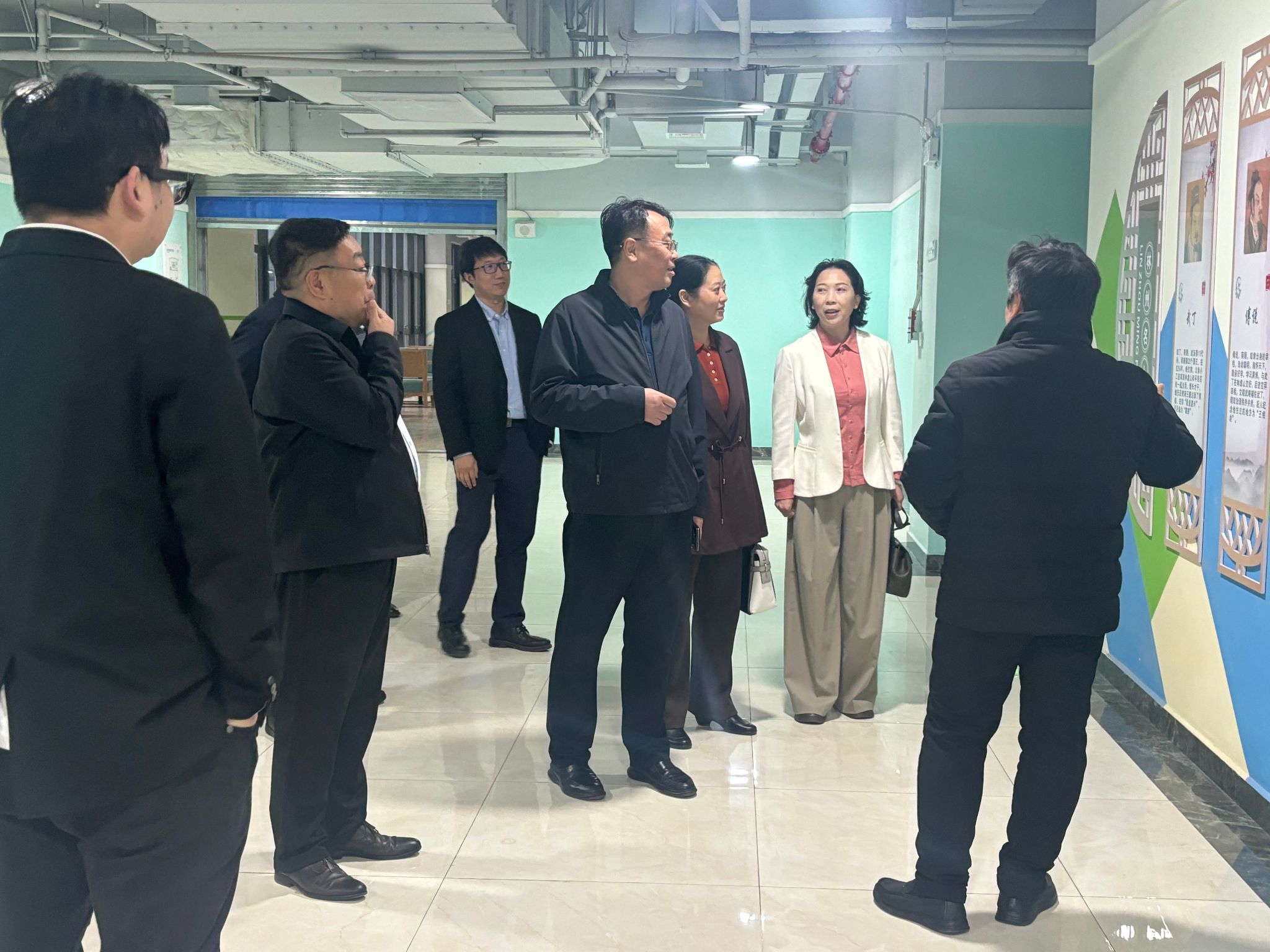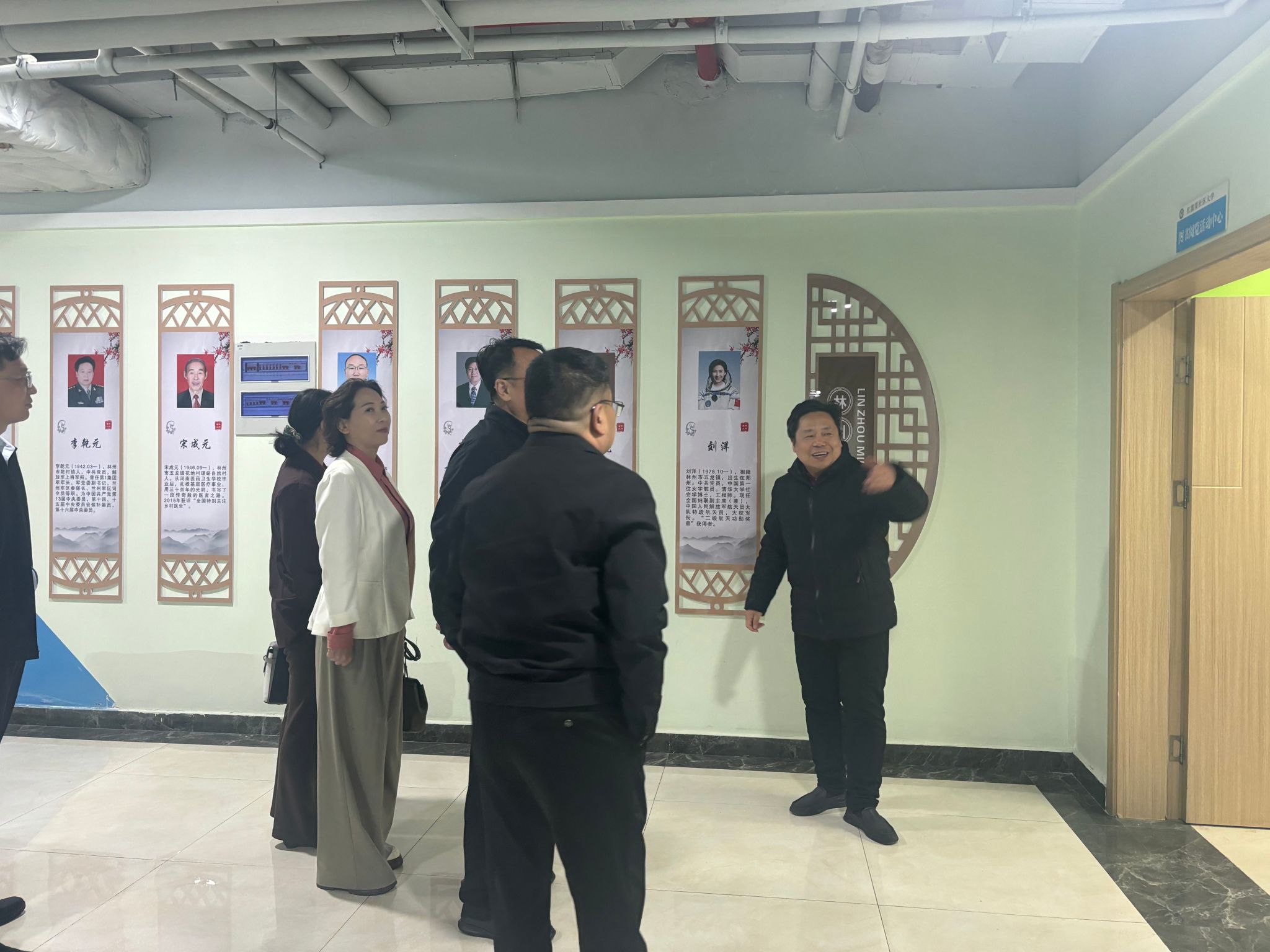 在馆长王学春的引导下,沈记全校长一行实地了解了图书馆的整体布局、馆藏资源建设与读者服务开展情况。作为学校文化育人的核心阵地,图书馆不仅拥有丰富的专业书籍与学术文献,更以特色文化墙为载体,全方位展现了林州地域精神与学院文化内涵。
