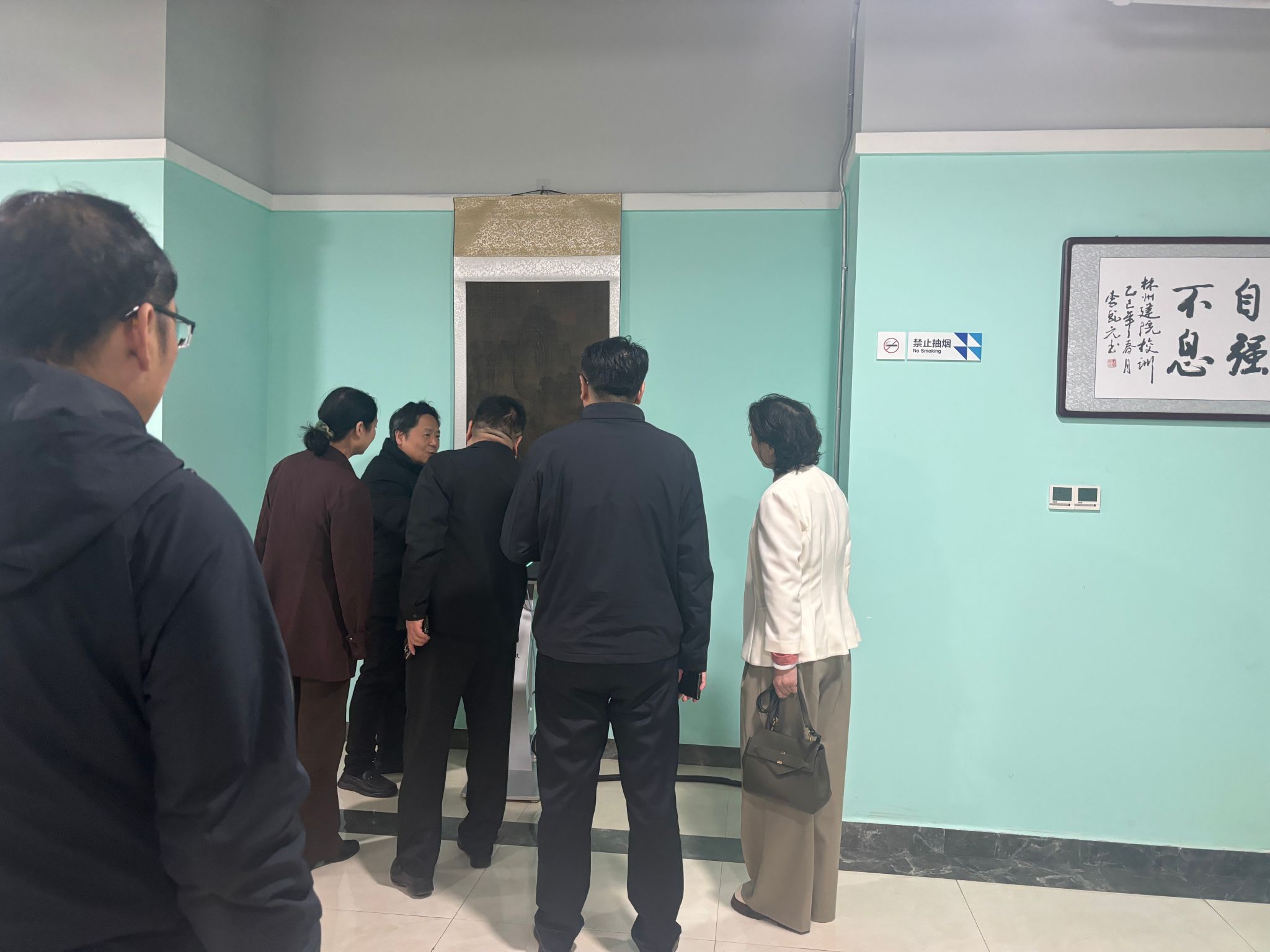 文化墙区域系统展示了林州历代名人风采,从商王武丁、宰相傅说,到红旗渠建设者任羊成、总设计师杨贵,再到航天英雄刘洋等当代英杰,人物事迹与文化作品相互映衬,构筑起多元立体的校园文化体系。考察团一行在荆浩《匡庐图》高仿品前驻足欣赏,这幅藏于中国台北故宫博物院的山水名作,以“大山大水、开图千里”的宏大气魄,成为诠释中华传统美学的鲜活范例。